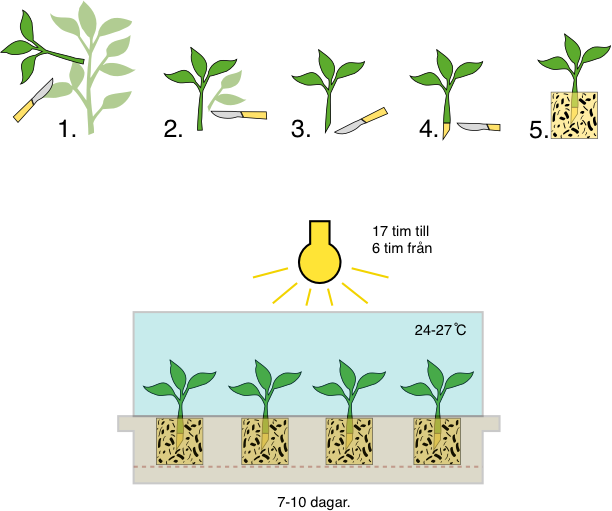 Skär med skalpell eller klipp med sax strax ovanför en gren i 45% vinkel. Ta ungefär två till fyra bladpar per klon som ska vara sex till tolv cm höga. Doppa en cm av "roten" i Clonex. Tryck försiktigt ner klonen i torvbrikett eller Rockwool-kub